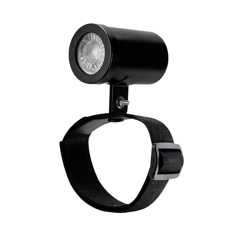 Projetor de jardim compacto com corpo cilíndrico, projetado para iluminação externa decorativa. Possui sistema de fixação por abraçadeira ajustável, ideal para instalação em troncos de árvores, postes ou estruturas similares, sem necessidade de perfuração. Conta com facho de luz direcionável, permitindo destacar árvores, plantas, esculturas e elementos paisagísticos com praticidade, versatilidade e efeito cênico elegante.